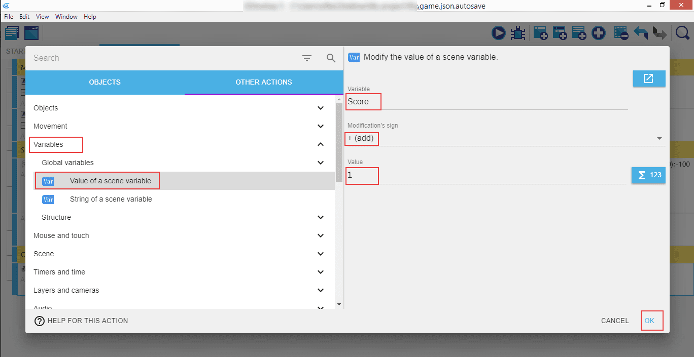 Click on the "Other actions", look for "Variables", and select "Value of a scene variable". Then in the right panel set the "Variable" name to "Score", "Modification's sign" to + (add), and the "Value" to 1. This means whenever a shape is collected by the Monster, the shape will disappear and the player will get one point.